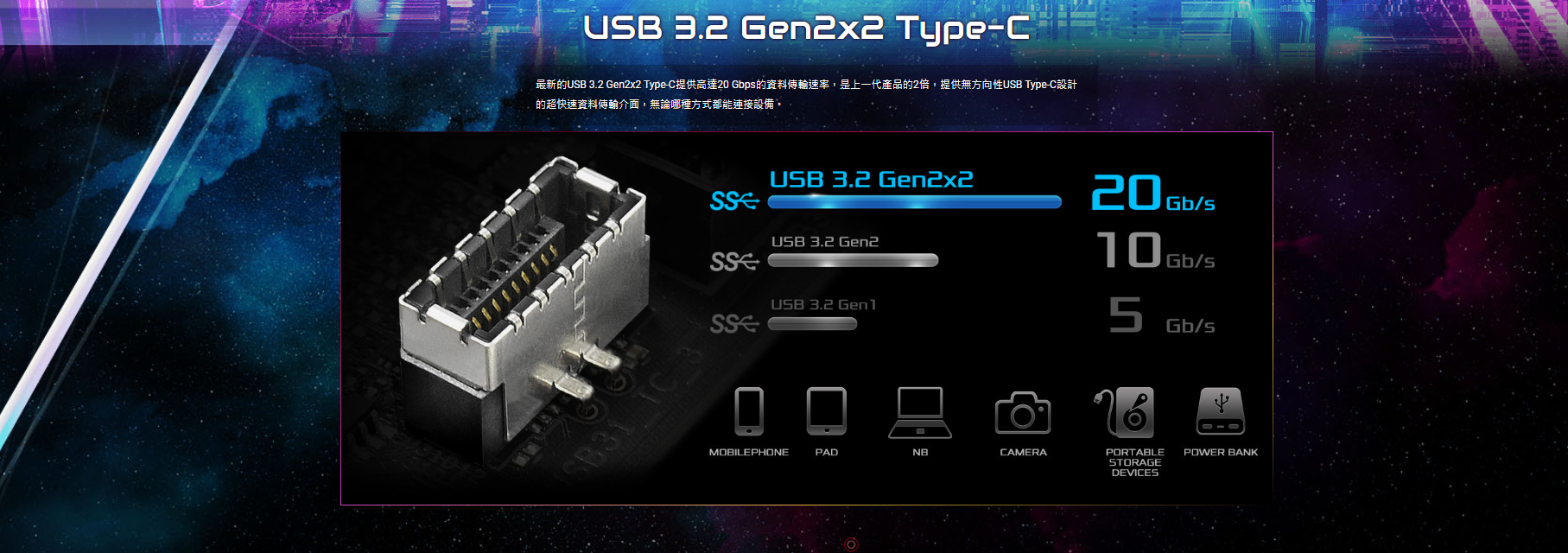● 1 USB 3.2 Gen2x2 Type-C (前置), 6 USB 3.2 Gen2 Type-A (後置), 2 USB 3.2 Gen1 (前置), 2 USB 2.0 (前置)